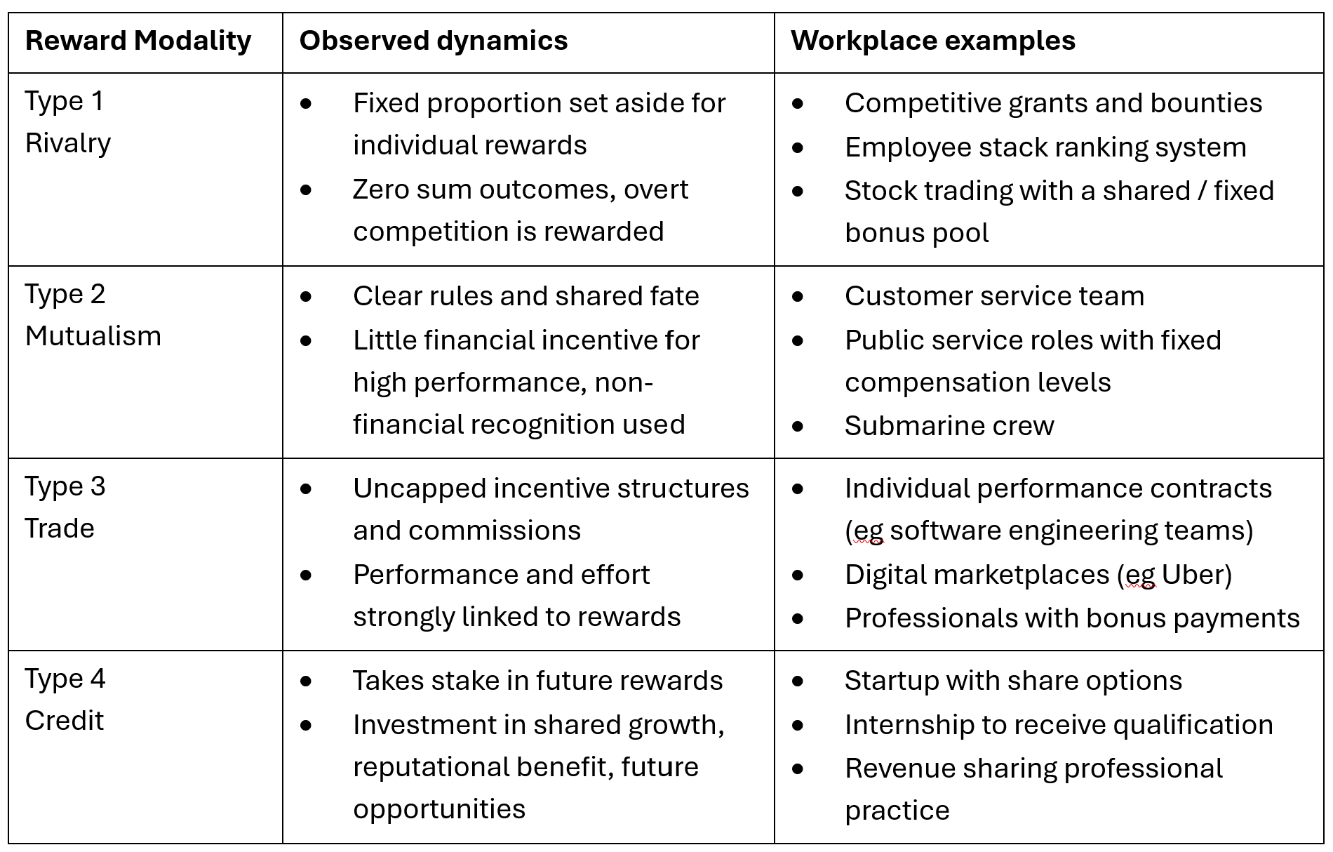 In the mutualism (type 2) modality, participants receive a fixed or standard reward and are not directly rewarded for organisational alignment. With little incentive to excel, type 2 rewards leverage norms and social pressures, and/or strong measures to equalise effort.