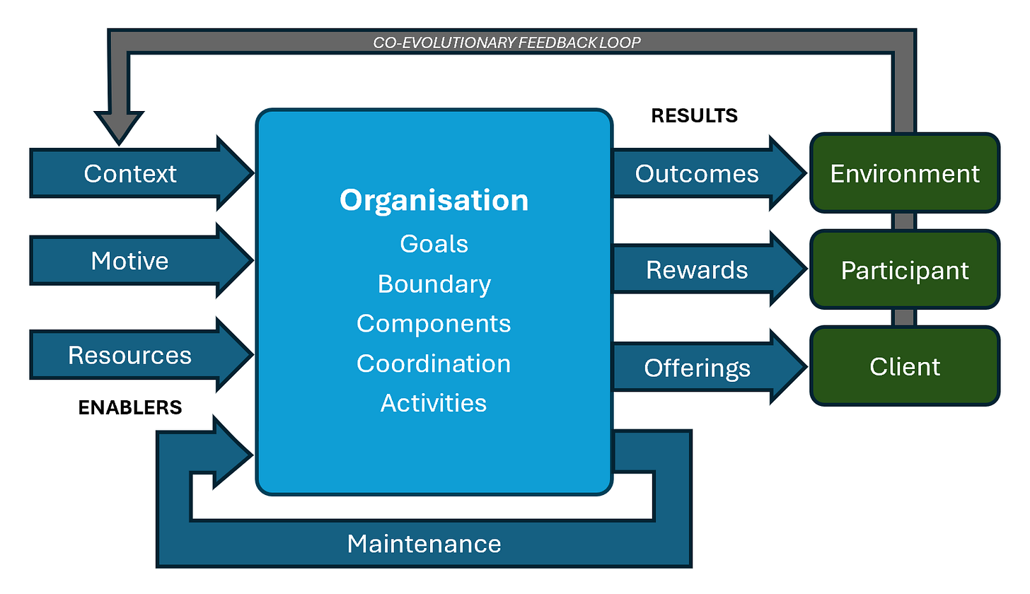 When all of these are present, an organisation can be constructed that delivers value in the form of results from its activities. Organisations are initially established through a series of conscious acts to align these enablers and commence operations.